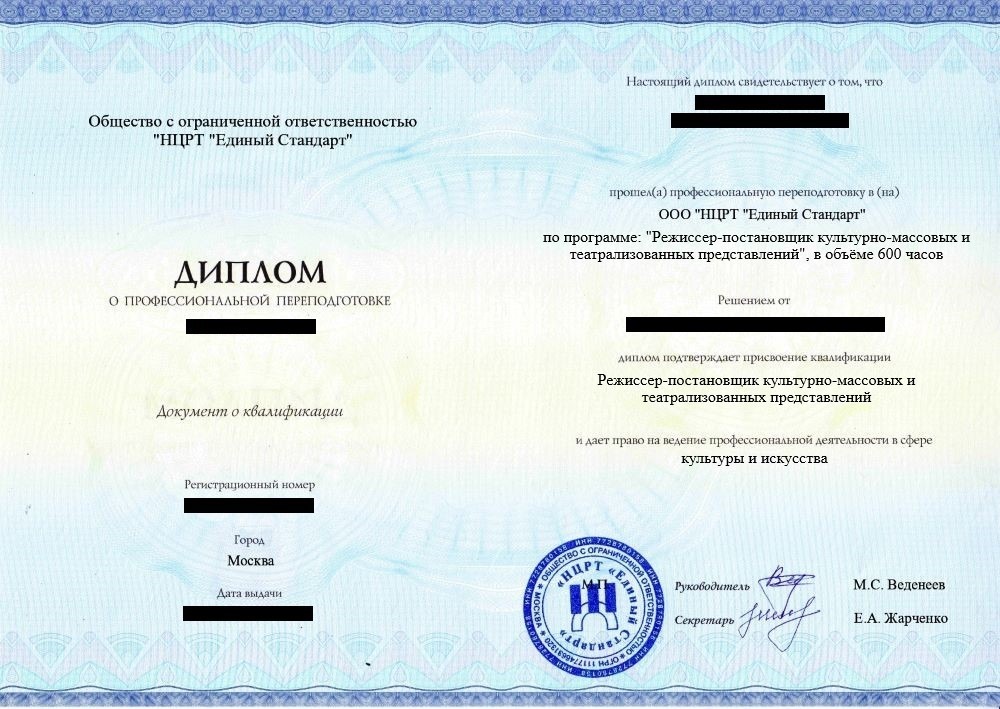 • «Режиссер-постановщик» с правом ведения профессиональной деятельности в сфере культуры и искусства